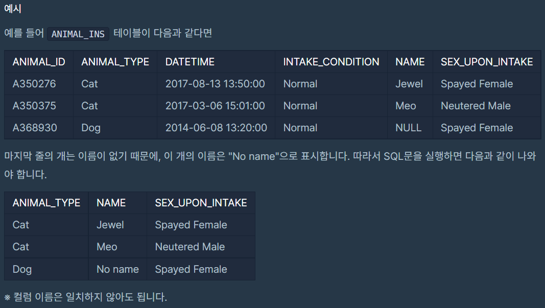 SELECT animal_type, IFNULL(name, 'No name') as NAME, sex_upon_intake
