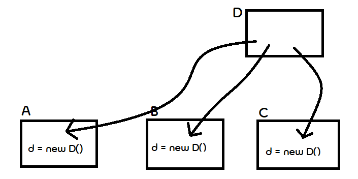 이때 A, B, C 클래스에서 각각 D라는 클래스가 필요해 가져다 쓴다면 메모리에 같은 객체가 3개 생기게 된다.