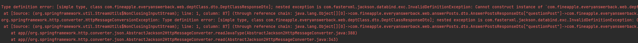 Dto 부분이 문제였고 이는 기본 생성자가 없기 때문이었다.