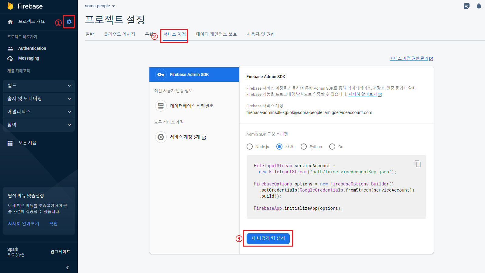 그리고 firebase 콘솔에 들어가 아래와 같이 Firebase Admin SDK의 새 비공개 키를 다운받는다.